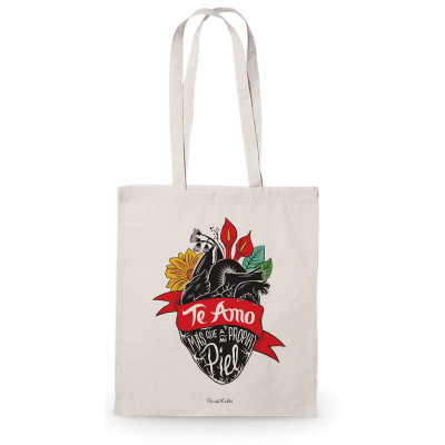 Bolsas de tela con color de la colección Frida Kahlo. Unas prácticas bolsas reutilizables con diferentes diseños inspirados en la obra de la conocida pintora mejicana y su pasión por la vida. Frida Kahlo es mundialmente reconocida por sus famosos autorretratos. Ella creó un estilo propio mezclando los aspectos de su vida con los elementos de la naturaleza y con costumbres de su país. Los diseños de las bolsas de tela Cuatrogotas son imágenes y motivos representados en los cuadros de Frida Kahlo. El material de las bolsas es 100% algodón y la estampación es de color Estas bolsas son resistentes y tienen una larga asa perfecta para poder llevarla colgada del brazo. Son muy prácticas para la compra y para utilizarse como bolso. Un complemento de moda práctico y de calidad.
