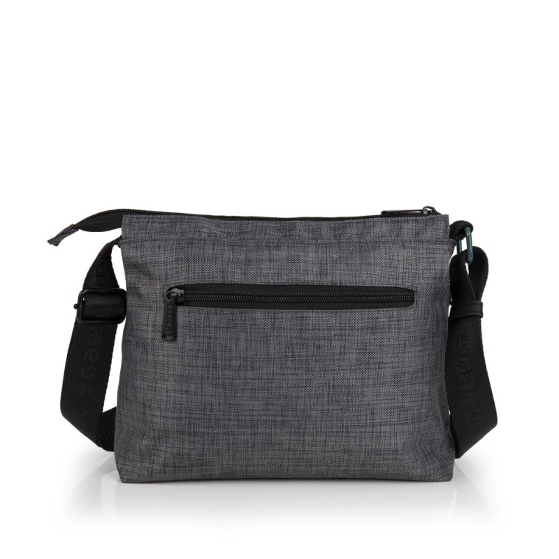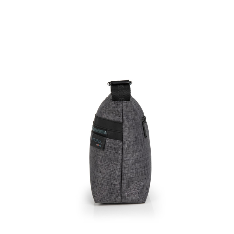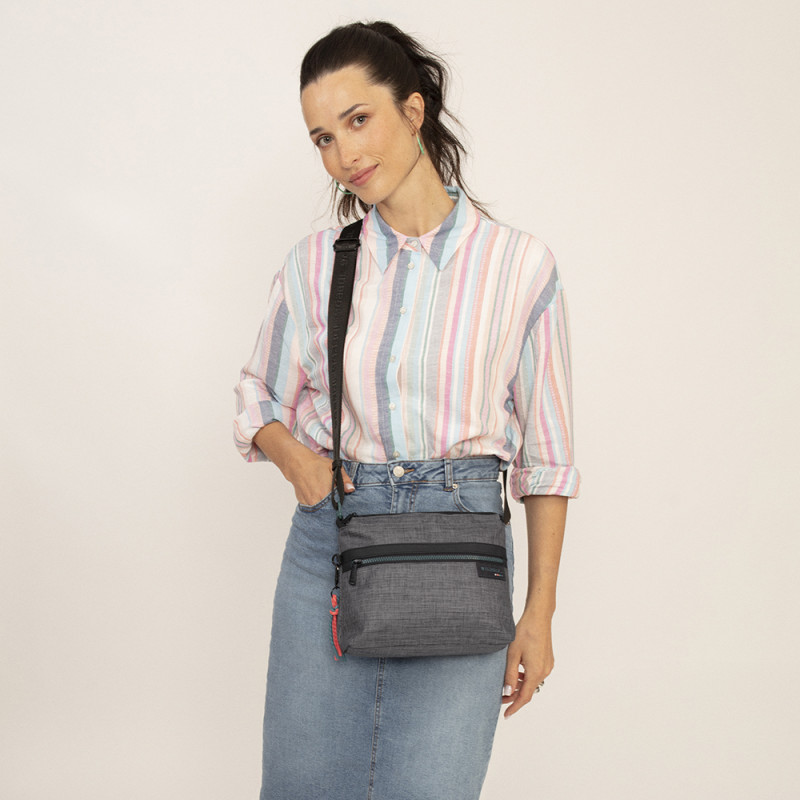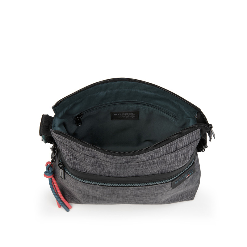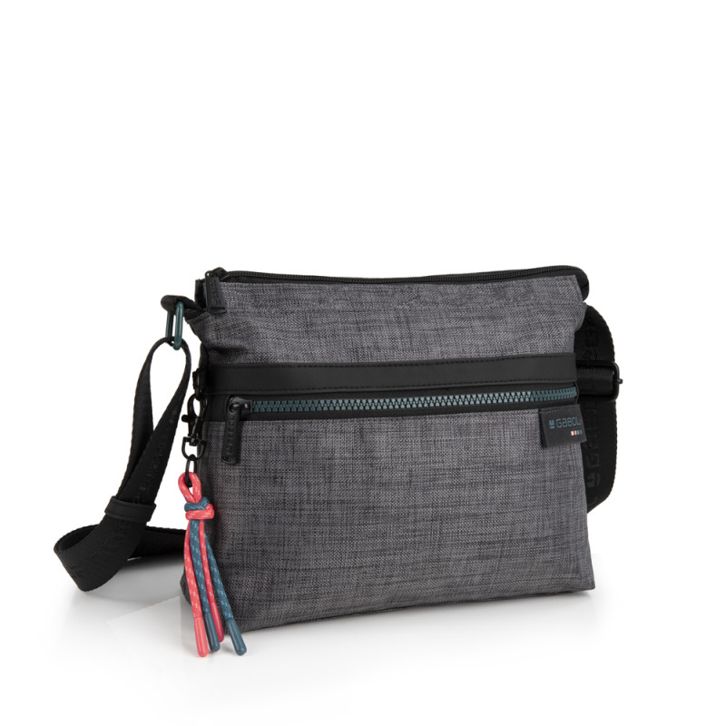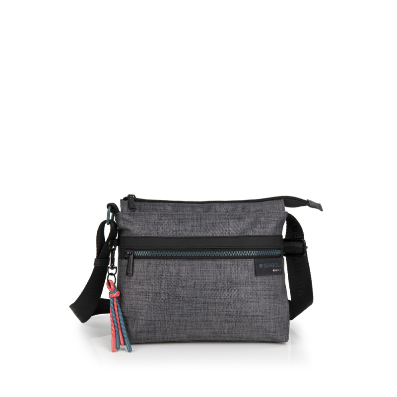 Bolso pequeño de la colección SHANI, fabricado en poliéster de color gris, con cremalleras de color azul y un llavero de tonos azules y corales para hacer tu bolso diario más llamativo. Su bolsillo frontal le aporta funcionalidad. Medidas: 24 x 19 x 9 cm, volumen: 2,8 L, peso: 0,24 kg. Libre de plásticos PVC.