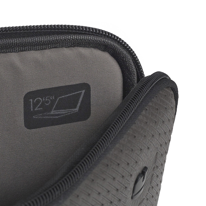 Funda para portátil 12,5» de piel sintética, marrón. Su interior está forrado y acolchado. Fabricada con material libre de plásticos PVC. Medidas: 32x23x2 cm. Volumen: 1,4 L