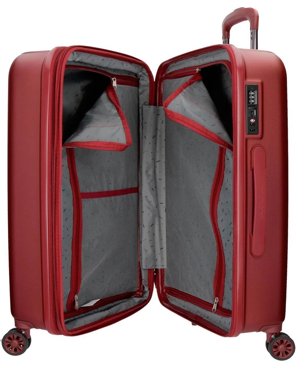 Maleta mediana de 45x65x28 cm. Tiene una capacidad de 68 litros y pesa 3,8 kg. Fabricada en ABS, un material resistente y ligero. Tiene un práctico interior con compartimentos cerrados con cremallera a ambos lados y tres bolsillos con cremallera de distintos tamaños. Cuatro ruedas dobles de giro multidireccional y cierre TSA integrado en la maleta para viajar seguro a cualquier parte del mundo y proteger tus efectos personales.