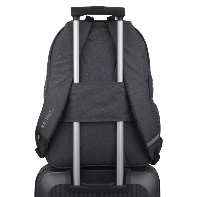 Mochila adaptable a carro Gabol WOLF. Mochila adaptable a carro con 2 compartimentos. Espalda acolchada para servir de amortiguación con el contenido. Protección añadida en las cremalleras. Hombreras acolchadas y reforzadas. Incluye identificador y organizador en su interior. Bolsillo en el lateral exterior. Material resistente al agua. Fabricada con material libre de PVC, con un tejido de alta densidad y mayor calidad. Medidas: 34x46x20 cm