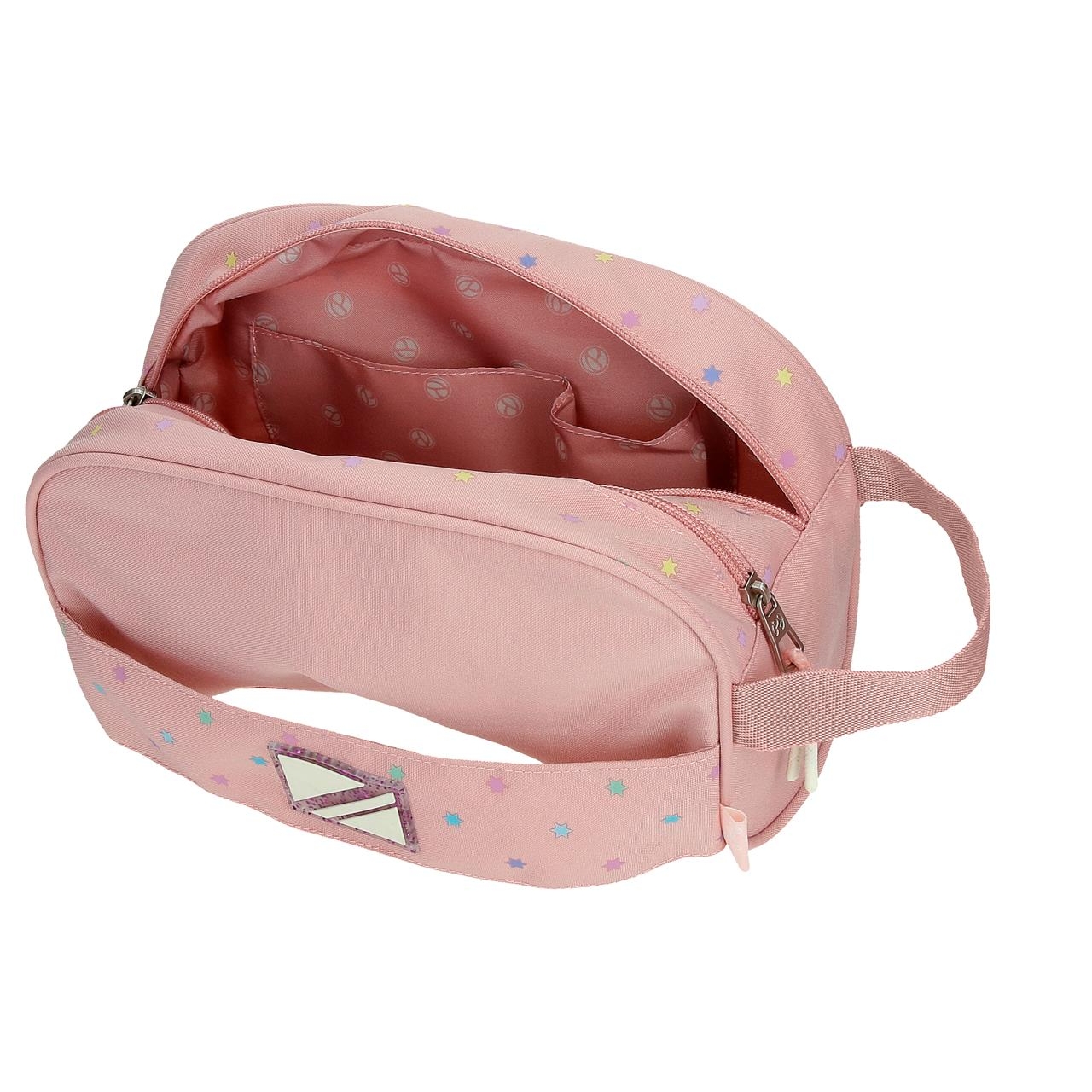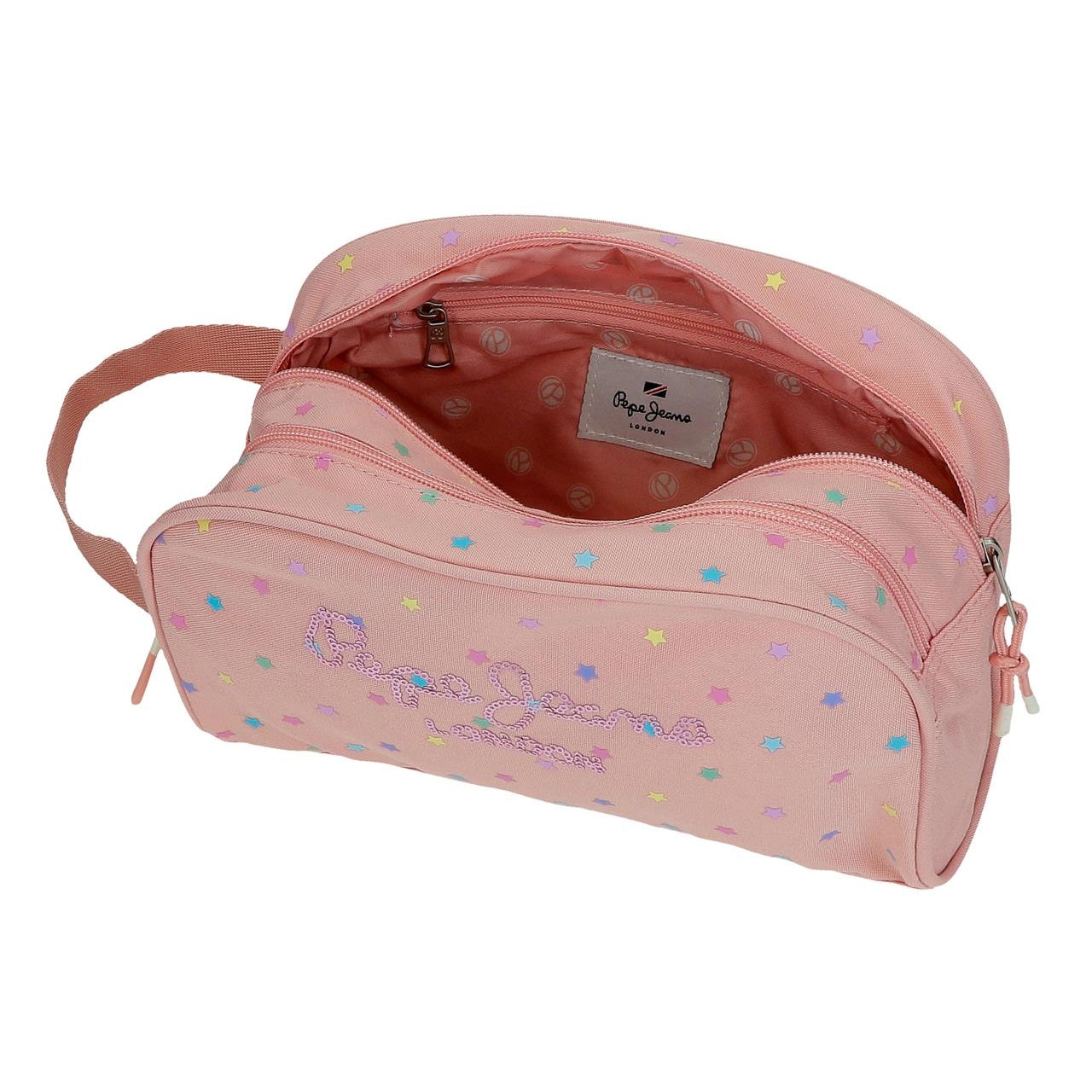 Dos compartimentos y tres bolsillos interiores, uno de ellos con cremallera, para llevar perfectamente ordenados los accesorios de aseo y los productos de belleza.