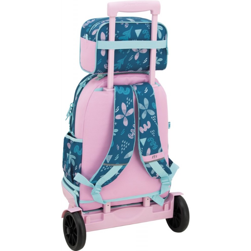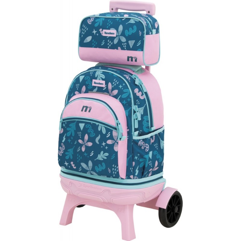 Dispone de un asa para facilitar su transporte y una banda trasera, que le permite adaptarse a la mochila con carro para usarlo de forma conjunta.