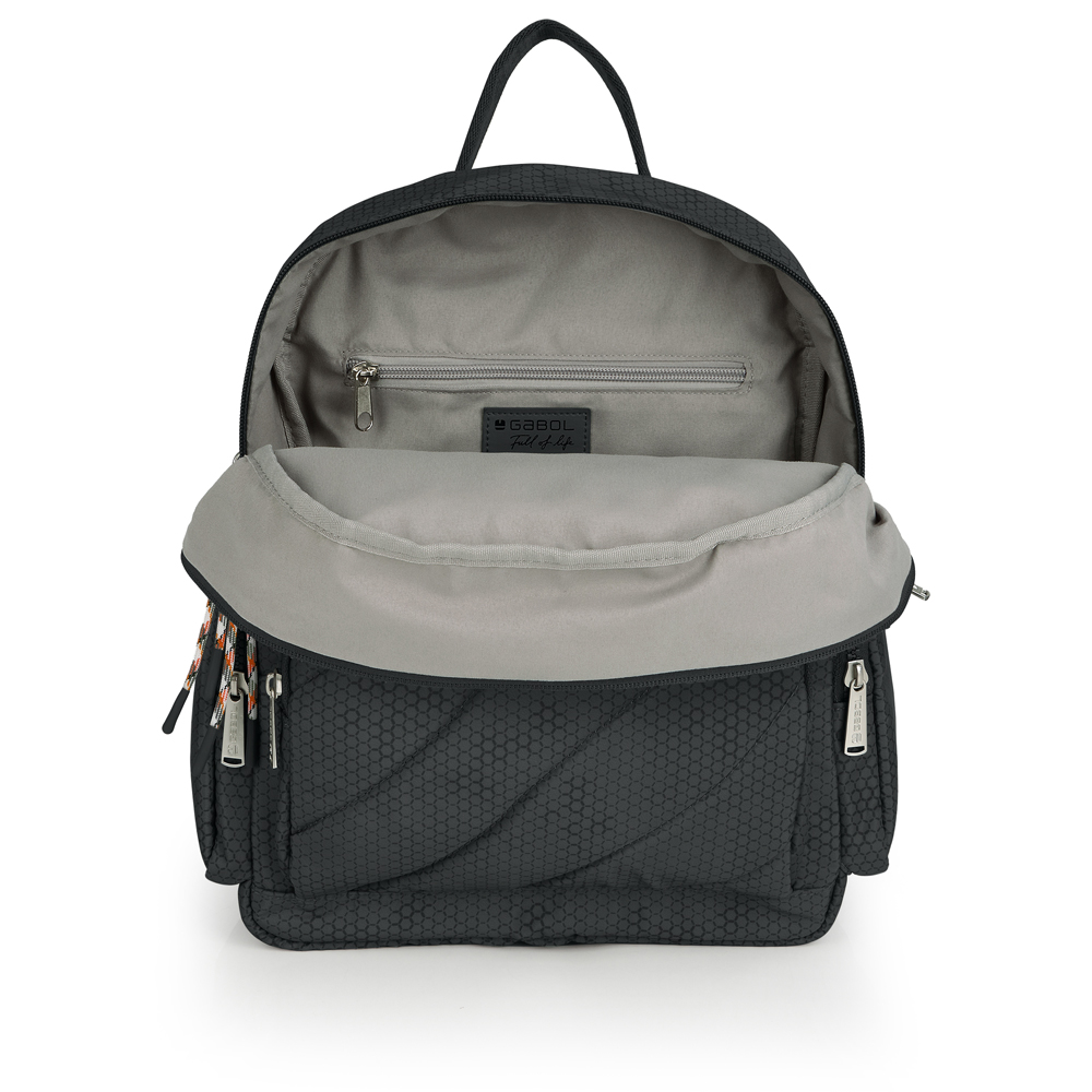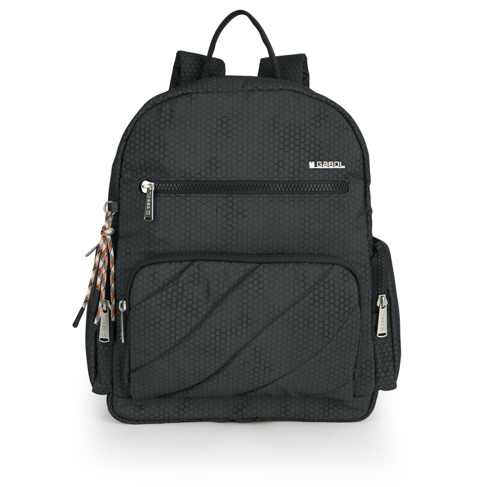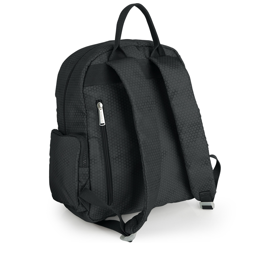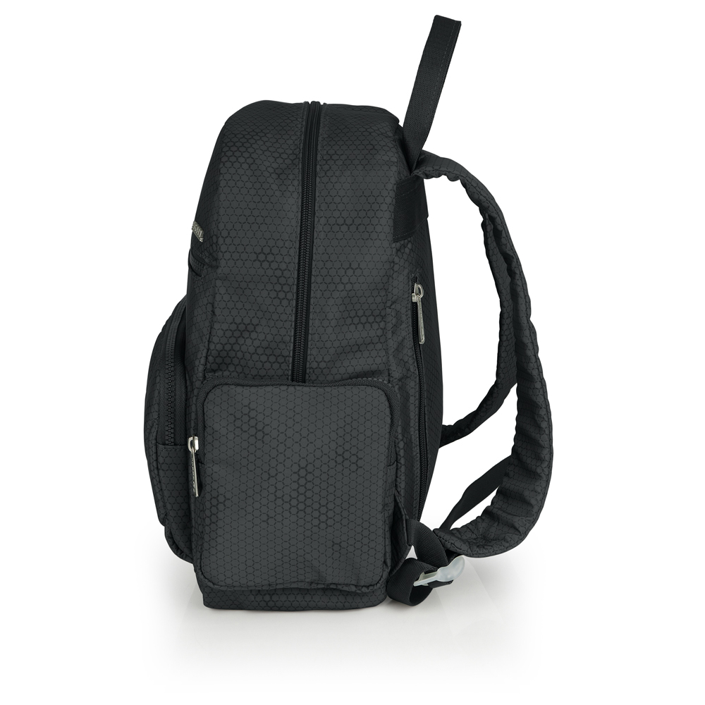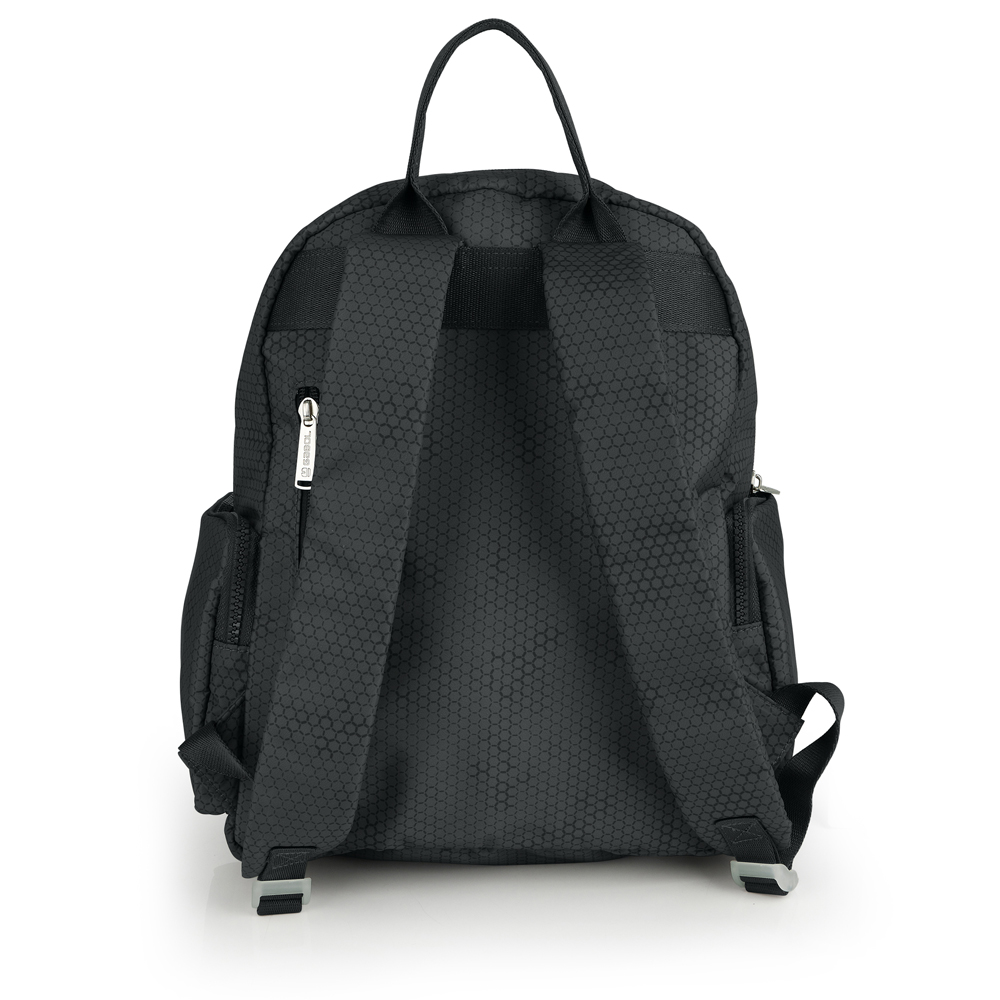 Mochila de poliéster. Material resistente al agua. Fabricado con materiales libres de plásticos PVC. Medidas 29x33x13 cm.