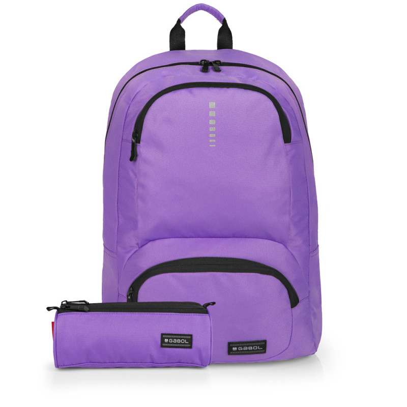 Pack de mochila y estuche triple resistente al agua. Detalle reflectante en el frontal. Fabricadas con material libre de PVC y resistentes al agua.
