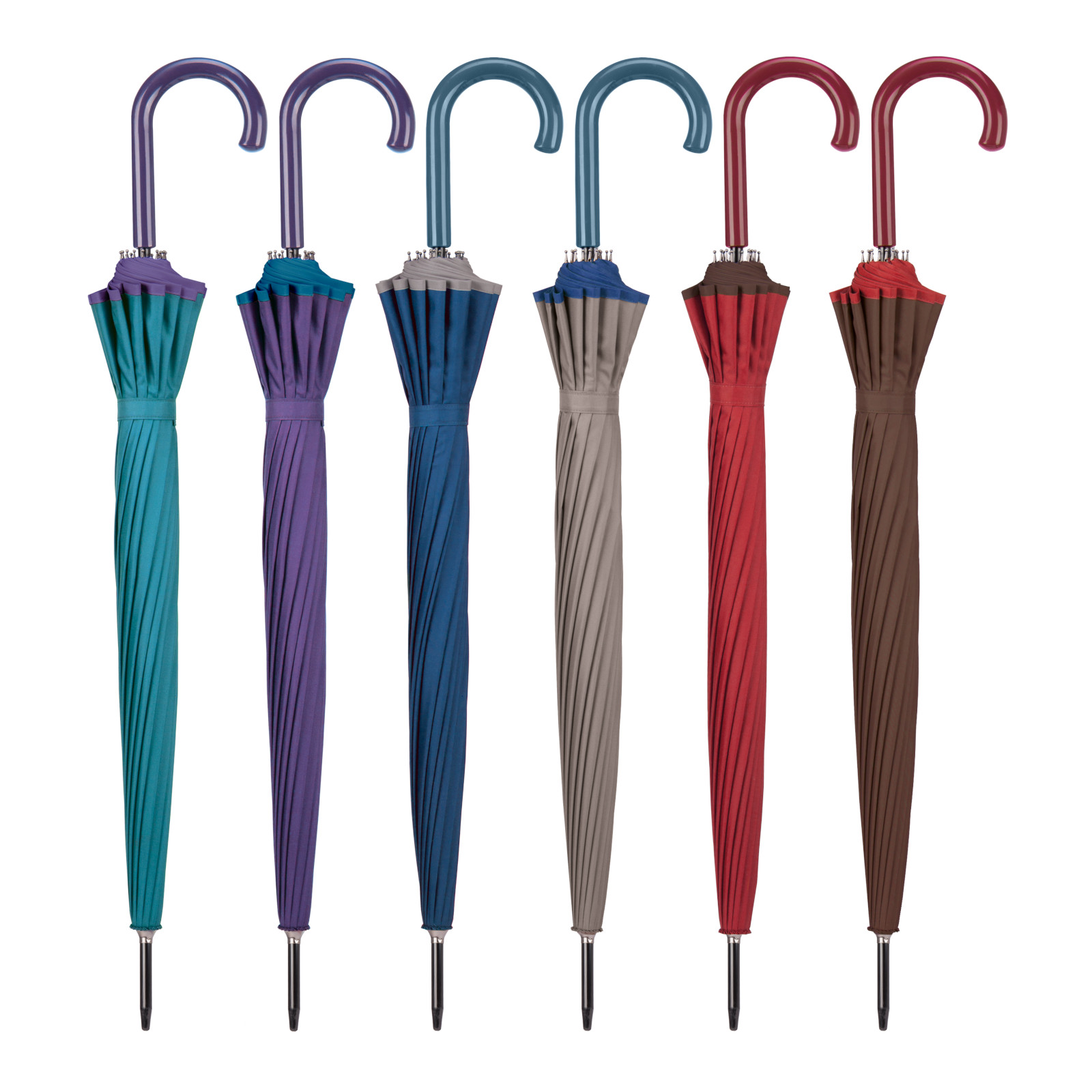 Un paraguas antiviento con varillas de fibra de vidrio. Con tejido pongee extra resistente al agua. Un paraguas de color liso, resistente y con 16 varillas .